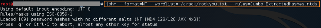 john --format=NT --wordlist=rockyou.txt --rules=Jumbo ExtractedHashes.ntds