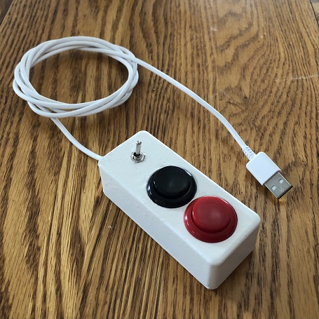 I recently built this device in order to automate some common tasks when working on my computer. It has two arcade-style buttons and a two-way toggle switch, allowing for up to four distinct “automations”. In this case, the red button “mutes” audio in Zoom meetings and the black button locks the desktop (making it easy to secure a machine before walking away). The toggle switch allows for compatibility with either Windows or Mac OS X operating systems.