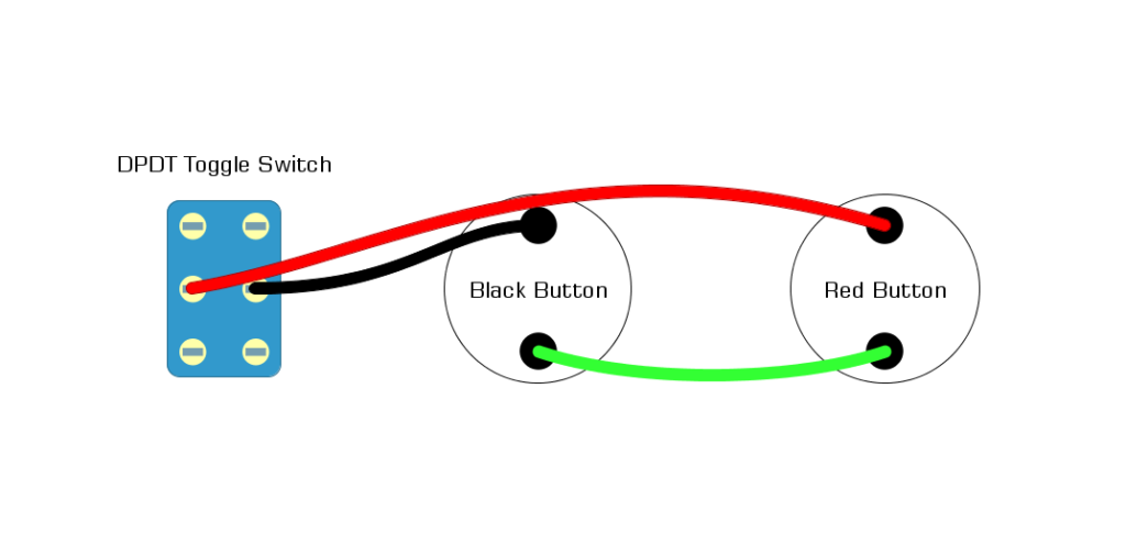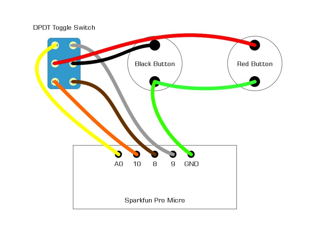 The wiring of this project is fairly simple. A functionally-equivalent project could simply have four buttons, rather than two with a switch. I personally liked the size and look of a design like this. The switch essentially turns the two buttons into four buttons. To better understand how everything is hooked up, take a look at the following wiring diagram: