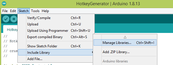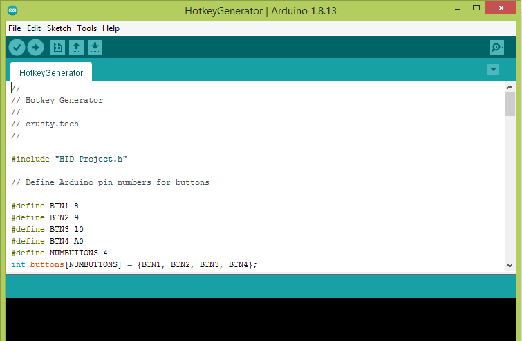 Double-click the HotkeyGenerator.ino file. It should automatically open up in the Arduino IDE program. If not, double-check that your install completed successfully. It may also prompt you that HotkeyGenerator.ino needs to exist in a folder called HotkeyGenerator; this is normal and you can accept the default for this.