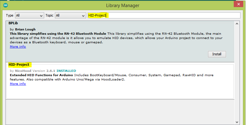 Here, search for HID-Project and click Install next to the library by “NicoHood”. This library allows the Pro Micro to act as a keyboard (“HID” stands for Human Interface Device, for instance a keyboard or mouse)