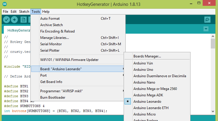 Now go to Tools > Board and select Arduino Leonardo. Although the Pro Micro is definitely NOT an Arduino Leonardo, they are apparently similar enough for this code to compile correctly using this setting.